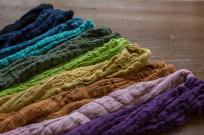 藍、お茶、くり皮…かせごとに染められた糸は、